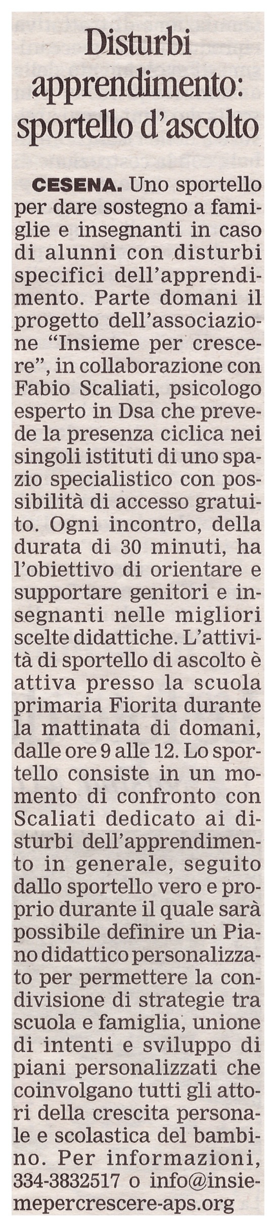 L’8 Aprile 2015 il Corriere parla dello sportello d’ascolto per genitori e insegnanti gestito dal dott. Fabio Scaliati sulle problematiche DSA