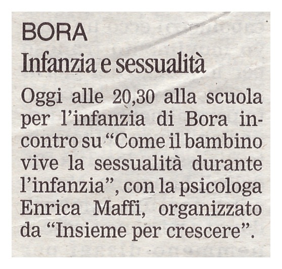Il 9 Aprile 2015 il Corriere segnala l’incontro su infanzia e sessualità tenuto dalla dott.ssa Enrica Maffi presso la scuola dell’Infanzia di Bora