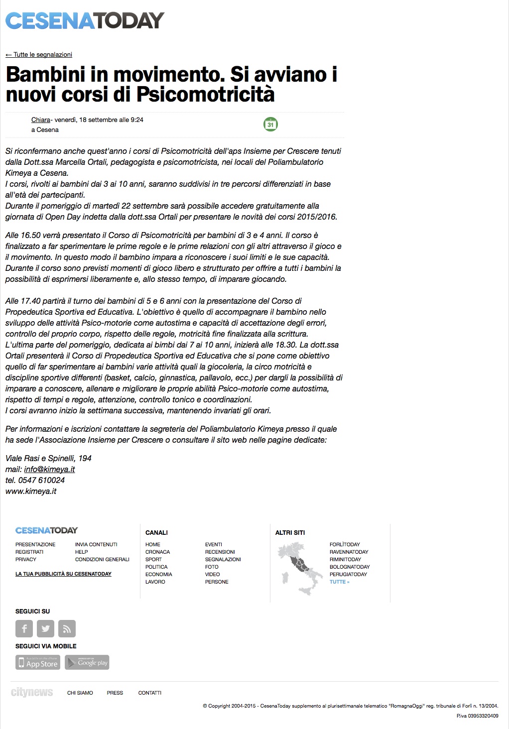 Venerdì 18 settembre 2015 Cesena Today parla dell’Open Day dei Corsi di Psicomotricità tenuti dalla dott.ssa Marcella Ortali.