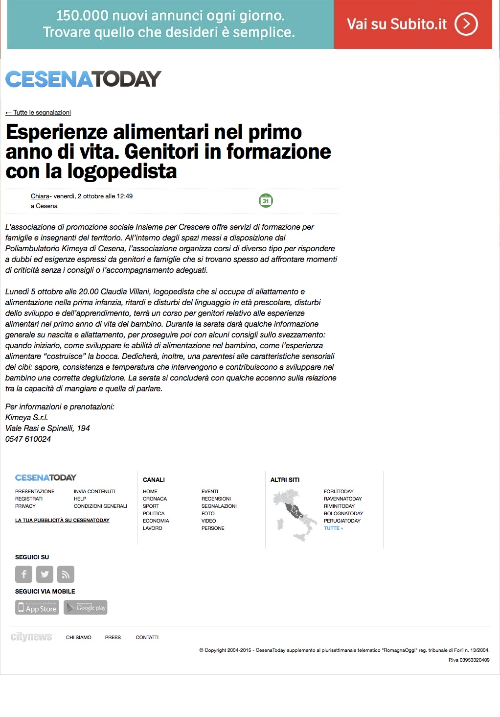 Venerdì 2 ottobre Cesena Today parla dell’incontro di formazione per genitori sullo svezzamento con la logopedista Claudia Villani.